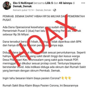 Demak – Beberapa waktu ini beredar kabar Hoax mengenai Dana Hibah sejumlah 56 M dari Pusat kepada Pemkab Demak. Dilansir dari Kepala BPKPAD Kab. Demak, Suhasbukit. Perlu kami informasikan bahwa berita tersebut tidak benar/hoax. 1. Telah dilakukan pengecekan ke kas daerah sampai hari ini Selasa, 9 juni 2020 TIDAK ADA TRANSFER YANG MASUK DARI PEMERINTAH …