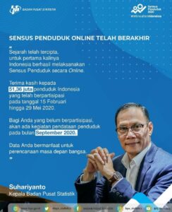 Demak – Rabu (3/6), Laman Sensus Penduduk Online telah berganti. Ucapan terima kasih ditujukan pada seluruh penduduk yang telah berpartisipasi. Hingga akhir periode pelaksanaan, tercatat 51.36 juta penduduk yang telah berpartisipasi mulai 15 Februari hingga 29 Mei 2020. Bagi yang belum berpartisipasi, akan ada kegiatan pendataan penduduk pada bulan September 2020. Kami akan datang lagi …