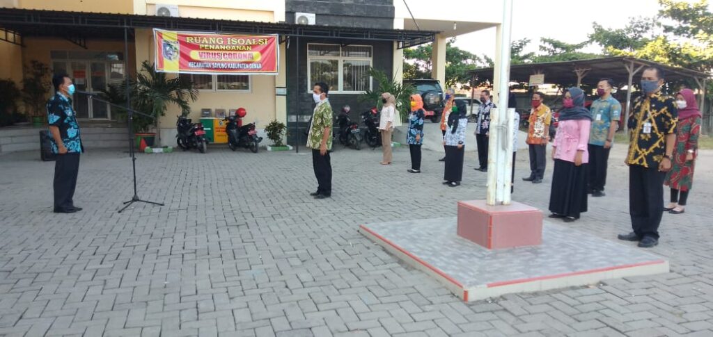 Dipimpin oleh Camat Sayung, Sururi, SH, MH. Meskipun ditengah maraknya COVID-19, pegawai/karyawan kecamatan Sayung tetap bersemangat dalam mengikuti APEL bersama. Dalam pelaksaan apel menggunakan jarak 1 meter sesuai peraturan yang telah di tentukan.