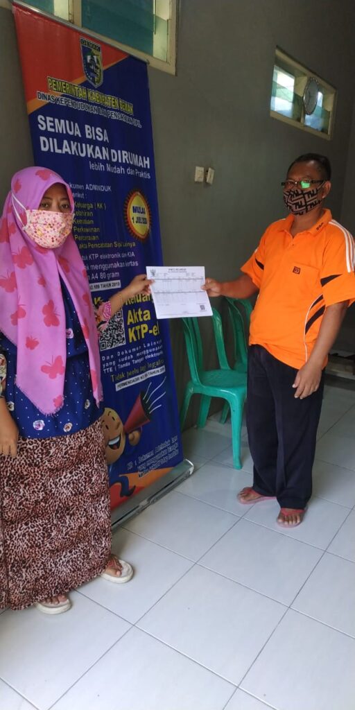 Demak – Koordinator Dindukcapil Demak di TPDK Kecamatan Wedung, Jumat (17/7) menyerahkan dokumen kependudukan berupa Kartu Keluarga (KK) kepada salah seorang warga, yaitu Saryono yang mengajukan permohonan perubahan data elemen data kependudukan berupa pemecahan Kartu Keluarga (KK) karena dia membentuk keluarga baru sehingga melakukan pemecahan Kartu Keluarga (KK) miliknya.