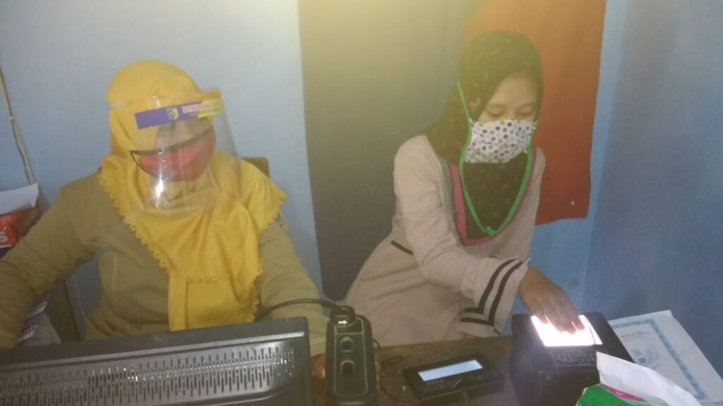 Nailis dilayani oleh Rois Nur Istiqomah, Operator Perekaman KTP-el dari Dindukcapil Demak yang ditugaskan di TPDK Kecamatan Dempet. Rois memakai face shield dan masker dalam melayani masyarakat di Kecamatan Dempet supaya terhindar dari penularan virus corona.