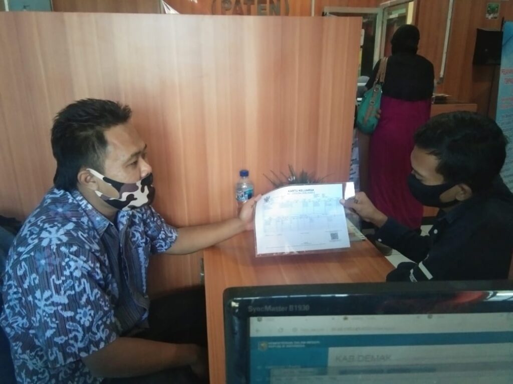 Demak – Nurhadi warga Desa Medini Rt 05 RW 01 Kecamatan Gajah mengambil dokumen Kartu Keluarga (KK). Sebelumnya, Nurhadi sudah mengajukan pembuatan KK secara online melalui alamat website di dukcapil.kabdemak.