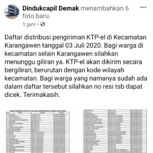 Demak – Daftar distribusi pengiriman KTP-el di Kecamatan Karangawen tanggal 03 Juli 2020. Bagi warga di kecamatan selain Karangawen silahkan menunggu giliran ya. KTP-el akan dikirim secara bergiliran, berurutan dengan kode wilayah kecamatan. Kasi Identitas Penduduk Dindukcapil Demak, Masrifah, S.Sos menjelaskan bahwa bagi warga yang namanya sudah ada dalam daftar tersebut silahkan nomor resi yang …