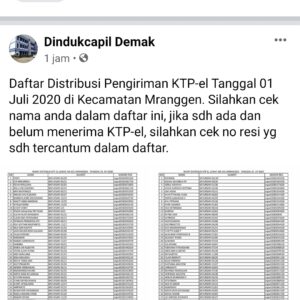 Demak – Hari ini (2/7) diumumkan melalui media sosial milik Dindukcapil Demak, antara lain melalui facebook dan Instagram, mengenai daftar nama warga Kecamatan Mranggen Kabupaten Demak yang dokumen kependudukannya berupa KTP-el dikirim melalui jasa ekspedisi. Sehingga warga Demak yang namanya tercantum dalam daftar distribusi pengiriman KTP-el dapat mengecek nomor resi pengiriman KTP-el. “Terhitung sejak tanggal …