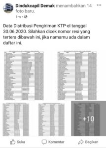 Demak – Hari ini (1/7) diumumkan melalui media sosial milik Dindukcapil Demak, antara lain melalui facebook dan Instagram, mengenai daftar nama warga Demak yang dokumen kependudukannya berupa KTP-el dikirim melalui jasa ekspedisi. Sehingga warga Demak yang namanya tercantum dalam daftar distribusi pengiriman KTP-el dapat mengecek nomor resi pengiriman KTP-el. “Terhitung sejak tanggal 22 Juni 2020, …