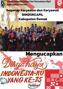 Demak – Di masa pandemi COVID-19, tidak mengurangi rasa untuk tetap bersemangat menjadikan Indonesia lebih maju. Dengan menjadi generasi penerus yang terus berjuang di tengah pandemi, kita harus tetap menjaga jarak, memakai masker, dan mematuhi protokol kesehatan. Segenap Keluarga Besar Dindukcapil Kabupaten Demak mengucapkan :“Dirgahayu Kemerdekaan Republik Indonesia ke-75”. Mari bersatu untuk Indonesia Maju.