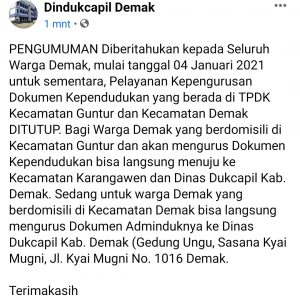 Pelayanan Kependudukan Di TPDK Kecamatan Guntur Dan Kecamatan Demak Ditutup