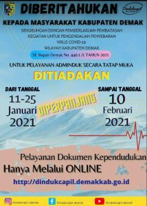 Demak – Terkait dengan Pengumuman Surat Edaran Bupati Demak Nomor 440.1/3 Tahun 2021 tentang Perpanjangan Pemberlakuan Pembatasan Kegiatan Masyarakat Untuk Pengendalian Penyebarab Corona Virus Disease 2019 (Covid 19) Di Wilayah Kabupaten Demak, maka pelayanan dokumen kependudukan secara tatap muka bagi masyarakat Demak, diperpanjang hingga tanggal 8 Februari 2021. Selama pelayanan tatap muka ditutup, masyarakat Demak …