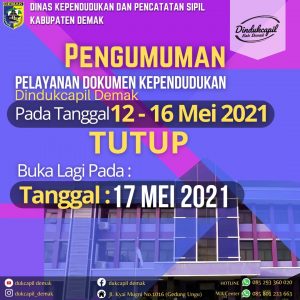 Demak – Sehubungan dengan perayaan Hari Raya Idul Fitri 1442 H, Kegiatan pelayanan administrasi kependudukan di Dinas Kependudukan dan Pencatatan Sipil Kabupaten Demak diliburkan pada tanggal 12 – 16 Mei 2021, dan buka kembali pada tanggal 17 Mei 2021. Plt. Kepala Dinas Kependudukan dan Pencatatan Sipil Kabupaten Demak, Eni Susiani, SE, MH mengatakan baik pelayanan …