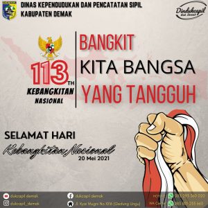 Demak – Hari ini, Kamis (20/5) bertepatan dengan Hari Kebangkitan Nasional yang diperingati setiap tanggal 20 Mei. Selamat Hari Kebangkitan Nasional ke 113. Bangkit! Kita bangsa yang tangguh. Dengan semangat Hari Kebangkitan Nasional mari kita sukseskan #GISA Gerakan Indonesia Sadar Adminduk, antara lain : Sadar Kepemilikan Dokumen Kependudukan, Sadar Pemutakhiran Data Penduduk, Sadar Pemanfaatan Data Kependudukan, Sadar …