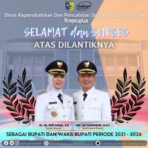 Demak – “Keluarga Besar Dindukcapil Kabupaten Demak mengucapkan selamat dan sukses Atas dilantiknya Ibu dr.Hj.Eisti’anah,S.E dan Bapak KH.Ali Makhsum, M.Si sebagai Bupati dan Wakil Bupati Demak, Semoga Amanah dan dapat membawa Demak lebih sejahtera, lebih berprestasi dan lebih baik lagi”, tutur Eni Susiani, SE, MH, Plt Kepala Dinas Kependudukan dan Pencatatan Sipil Kabupaten Demak, kemarin …