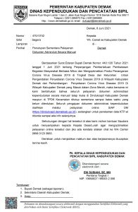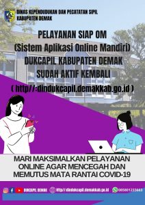 Demak – Diberitahukan kepada masyarakat Kabupaten Demak, mulai hari ini tanggal 08 Juni 2021 Pelayanan Online Adminduk melalui Aplikasi SIAP OM sudah bisa digunakankan kembali. Pelayanan Online Adminduk melalui Aplikasi SIAP OM bisa diakses melalui melalui Website : http://dindukcapil.demakkab.go.id dan pelayanan melalui WA Center di 085801233663. “Yuk ikut mencegah penyebaran Covid-19 dengan mematuhi protokol kesehatan …