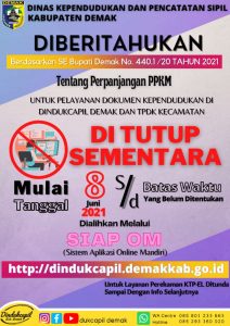 Demak – Berdasarkan SE Bupati Demak No 440.1/20 Tahun 2021 tanggal 1 Juni 2021 tentang perpanjangan PPKM untuk pengendalian penyebaran covid-19 di Kab Demak yang masuk dalam zona merah, maka seluruh pelayanan administrasi kependudukan tatap muka di Dindukcapil Kabupaten Demak maupun di TPDK (Tempat Perekaman Data Kependudukan) Kecamatan se-Demak ditutup sampai batas waktu yang belum …
